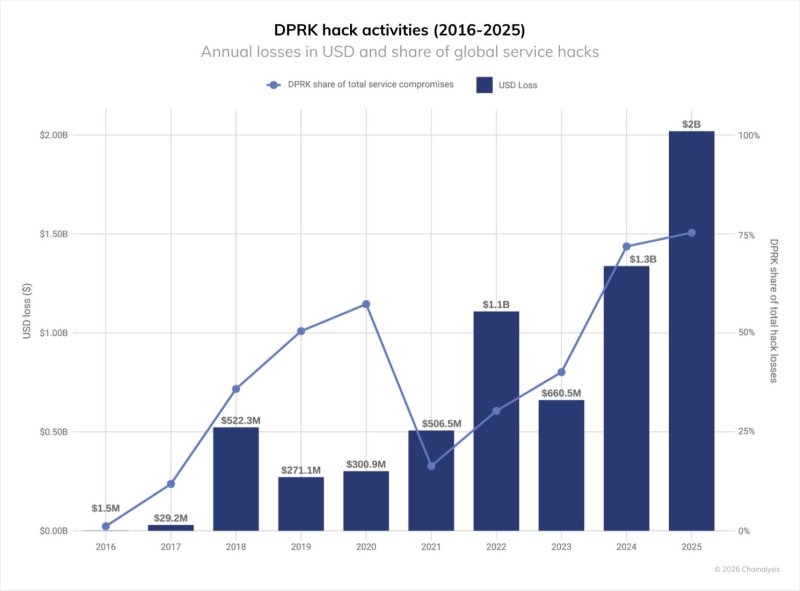 Ежегодный отчет блокчейн-аналитиков из компании Chainalysis показал, что за прошедший год злоумышленники похитили 3,41 млрд долларов в криптовалюте. При этом более 2,02 млрд было украдено северокорейскими хакерами, и почти 1,5 млрд пришлось на ограбление криптовалютной биржи Bybit.