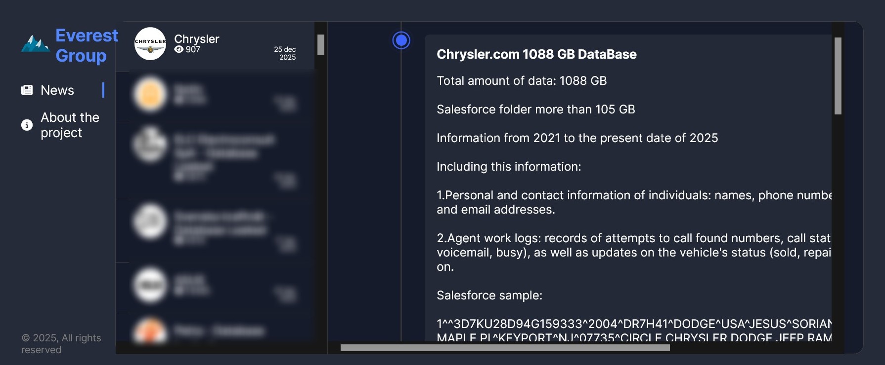 Хакерская группировка Everest опубликовала на своем сайте в даркнете заявление о взломе систем американского автопроизводителя Chrysler. Согласно заявлению злоумышленников, они украли у компании 1088 ГБ данных — всю базу, связанную с операциями Chrysler.