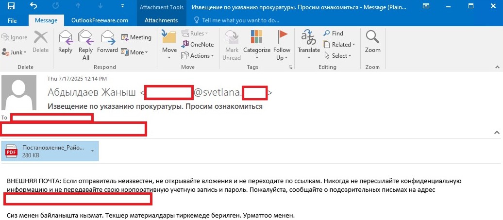 Основным вектором заражения остается целевой фишинг. Письма на локальных языках (узбекский, кыргызский) маскируются под официальные документы от судов или прокуратуры. Во вложении — PDF с текстом типа «Материалы дела» и ссылкой на скачивание. Жертве предлагают сначала установить Java Runtime Environment, а затем открыть приложенный файл.