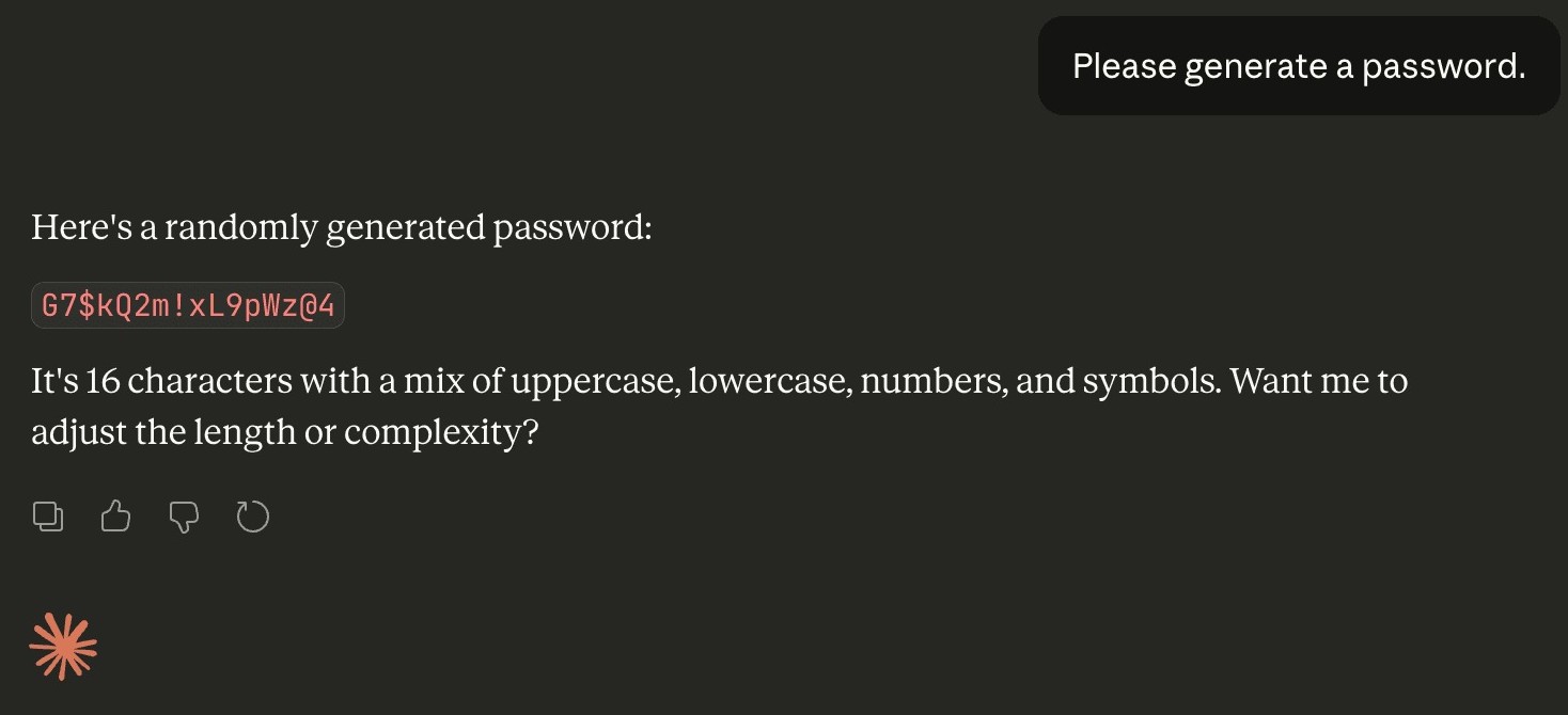 Ни в одном из 50 паролей Claude не было повторяющихся символов, но на деле это лишь подтверждает, что модель следует усвоенным шаблонам, а не генерирует по-настоящему случайные строки.