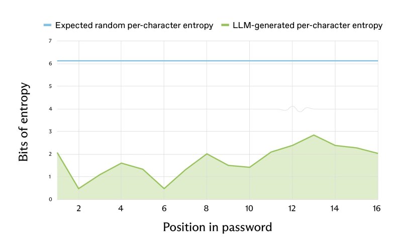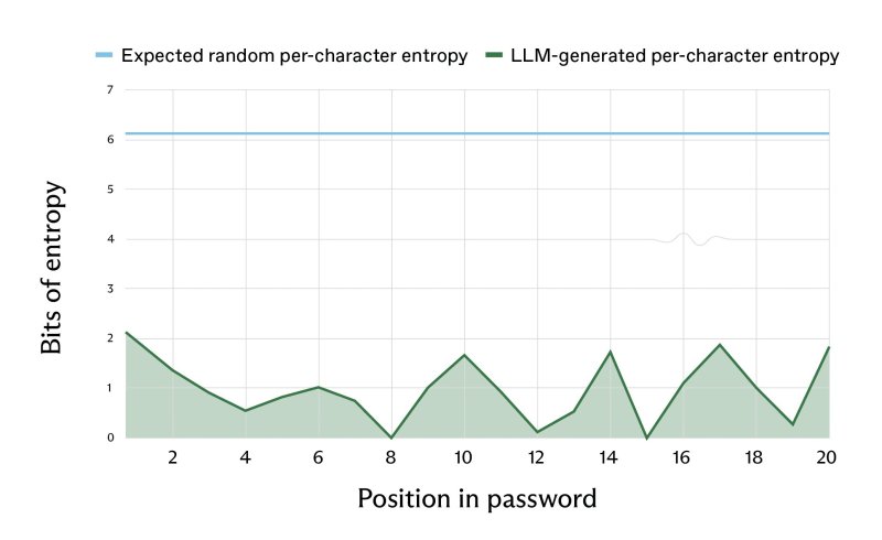 Чтобы оценить реальную энтропию, специалисты применили формулу Шеннона и вероятностный анализ на основе лог-вероятностей самих моделей. Результаты оказались удручающими: для пароля из 16 символов LLM обеспечивали энтропию около 27 бит (по символьной статистике) и около 20 бит (по лог-вероятностям). Для сравнения — по-настоящему случайный пароль той же длины должен давать 98 и 120 бит соответственно. Фактически это означает, что созданный LLM пароль можно взломать за несколько часов простым брутфорсом даже на старом «железе».