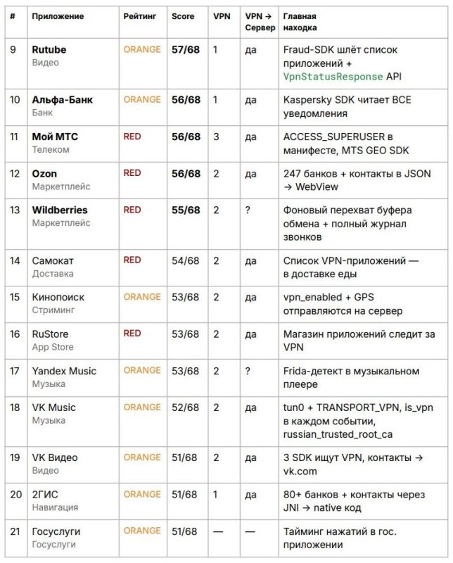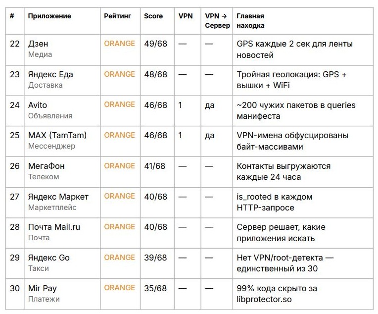 Банковские приложения в целом оказались наиболее агрессивной группой: в топ-20 вошли «Т-Банк» (65 баллов), «Сбербанк Онлайн» (64), ВТБ (59). Все они передают VPN-статус на свои серверы, используют расширенный фингерпринтинг устройства и обнаруживают инструменты реверс-инжиниринга.