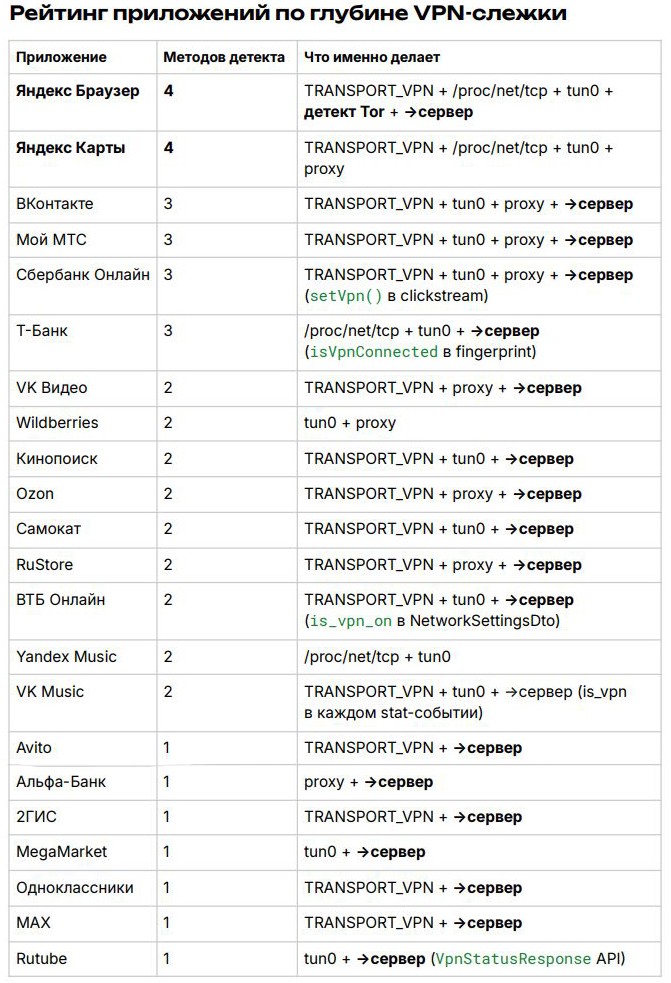 Лидерами по числу применяемых методов оказались «Яндекс Браузер» и «Яндекс Карты», каждый использует четыре из шести возможных способов определения использования VPN.