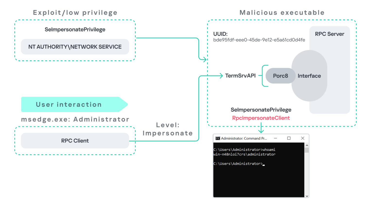 По сути, если злоумышленник скомпрометировал процесс с привилегией SeImpersonatePrivilege (по умолчанию она есть у учетных записей Local Service и Network Service), он может поднять поддельный RPC-сервер, перехватить запрос от привилегированного процесса и действовать от его имени.