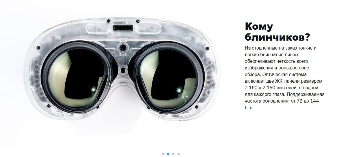 Шлем оснащён парой ЖК-дисплеев с разрешением 2160 × 2160 пикселей для каждого глаза и поддержкой частоты обновления от 72 до 144 Гц. Кастомные блинчатые линзы обеспечивают горизонтальный угол обзора до 110 градусов. Шлем поддерживает настройку диапазона межзрачкового расстояния от 60 до 70 мм; его можно использовать с обычными очками. Размер последних не должен превышать 140 мм в ширину. Для сравнения, шлем Valve Index оснащён экранами с разрешением 1440 × 1600 пикселей и частотой обновления до 144 Гц на каждый глаз.
