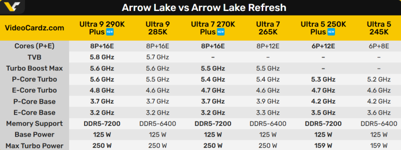 В обновлённой версии Arrow Lake Refresh эти улучшения интегрированы непосредственно в спецификации процессоров. Флагманский Core Ultra 9 290K Plus сохранит конфигурацию 8 производительных (P-core) и 16 эффективных ядер (E-core), как у модели 285K, но увеличит максимальную частоту Thermal Velocity Boost до 5,8 ГГц (было 5,7 ГГц). Частота E-core Turbo также вырастет — до 4,8 ГГц. При этом базовое энергопотребление останется на уровне 125 Вт, а максимальное — на уровне 250 Вт.