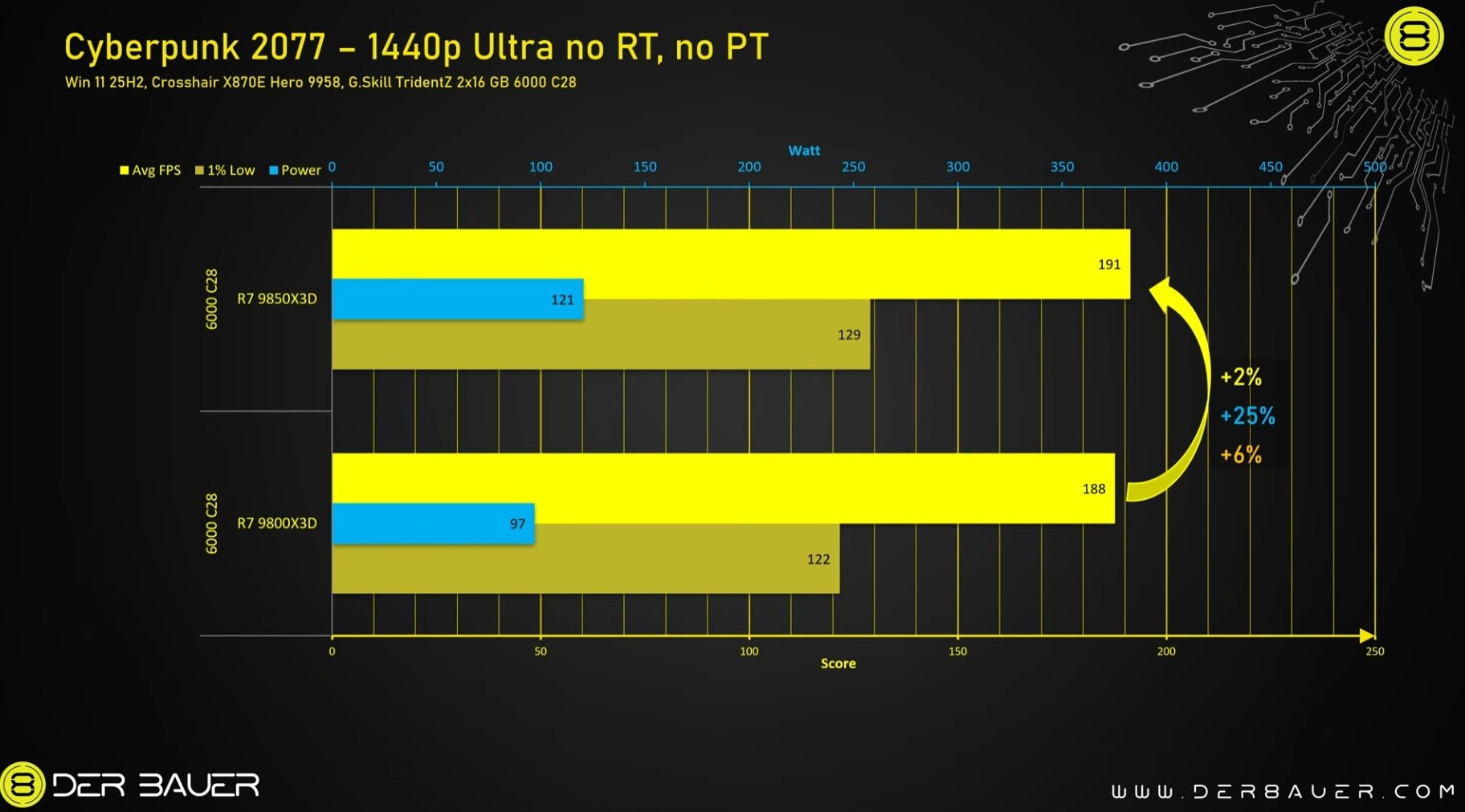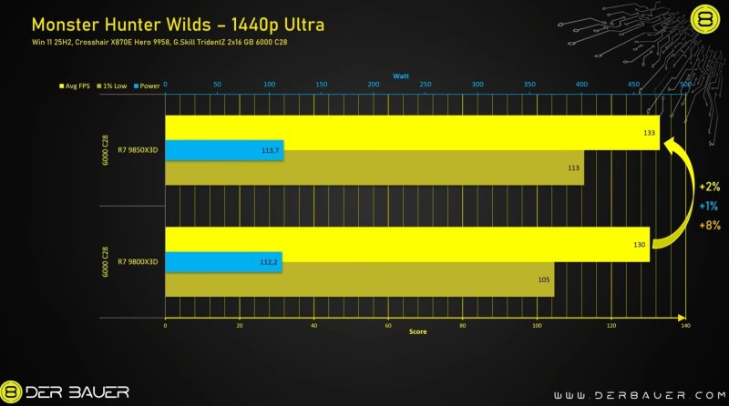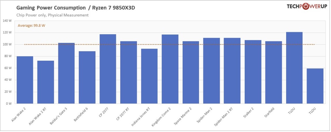 Роман отмечает, что вместе с производительностью выросло и энергопотребление процессора, особенно в графически нагруженных играх, таких как Cyberpunk 2077. Там прирост составил 25 % — с примерно 97 Вт у Ryzen 7 9800X3D до 121 Вт у новинки. В то же время в некоторых сценариях разница в энергопотреблении между двумя процессорами была в пределах 1 %.