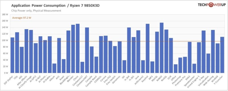 Энергопотребление процессора при лёгкой нагрузке по сравнению с Ryzen 7 9800X3D (27 Вт) у нового чипа выросло до 36 Вт, в приложениях среднее потребление составило 97 Вт, а в играх — около 100 Вт (данные TechPowerUp).