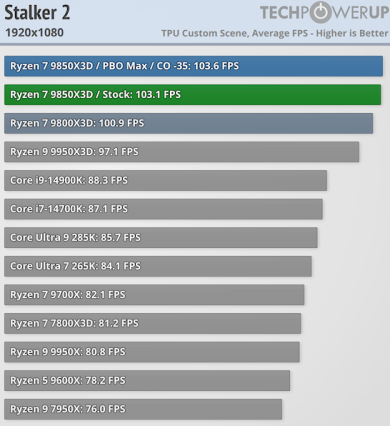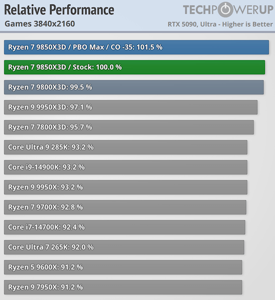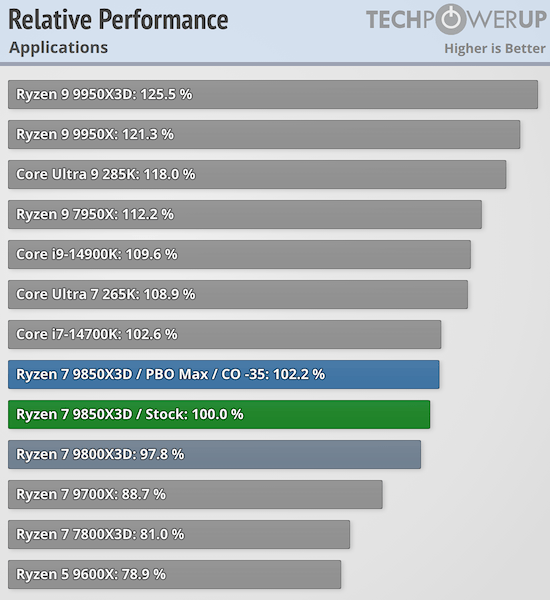 По данным портала TechPowerUp, производительность Ryzen 7 9850X3D в приложениях немного улучшена по сравнению с Ryzen 7 9800X3D — примерно на 2,2 % в среднем. При рассмотрении отдельных тестов наибольший прирост наблюдается в однопоточных нагрузках, где реальное повышение производительности составляет 5–7 %. В приложениях с многопоточностью производительность практически идентична Ryzen 7 9800X3D.