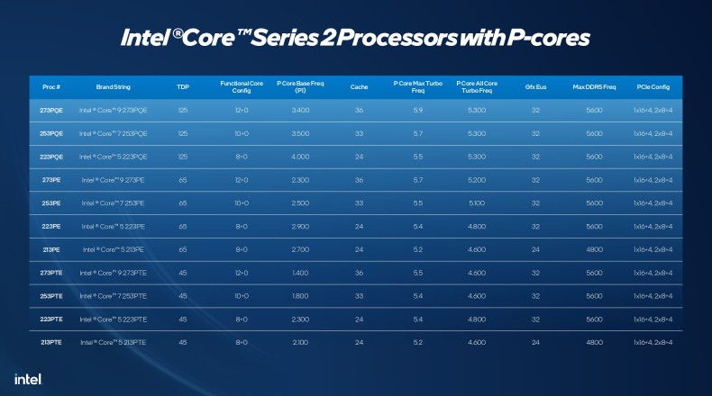 Старшей моделью серии является Intel Core 9 273PQE. Это 12-ядерный процессор с поддержкой 24 виртуальных потоков, оснащённый 36 Мбайт кеш-памяти. Чип работает на частоте до 5,9 ГГц. Номинальный заявленный показатель энергопотребления (TDP) процессора составляет 125 Вт. В серии также выделяются модели Core 9 273PE с частотой до 5,7 ГГц и TDP 65 Вт и Core 9 273PTE с частотой до 5,5 ГГц и TDP 45 Вт. Все три модели построены по техпроцессу Intel 7 и предлагают одинаковую конфигурацию ядер. С остальными моделями серии и их характеристиками можно ознакомиться в таблице ниже.