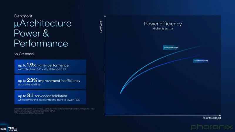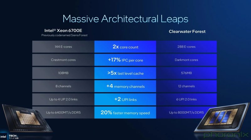 Разработанные для гипермасштабируемых центров обработки данных, поставщиков облачных услуг и телекоммуникационных компаний, чипы Clearwater Forest позволяют масштабировать рабочие нагрузки, снижать расходы на электроэнергию и поддерживать более интеллектуальные сервисы. Что касается Intel 18A, компания с гордостью заявила, что это первый техпроцесс класса 2 нм, разработанный и запущенный в США, обеспечивающий на 15 % более высокую производительность на ватт и на 30 % — более высокую плотность кристалла (по сравнению с Intel 3). Новый техпроцесс был разработан, сертифицирован для производства и внедрён на предприятии компании в Орегоне, а сейчас готовится к запуску в Аризоне. Intel 18A использует транзисторную архитектуру Intel RibbonFET, обеспечивающую более высокую масштабируемость и более эффективную коммутацию, а также технологию PowerVia — систему питания с тыльной стороны чипа, оптимизирующую электрические токи и передачу сигналов. Кроме того, в Clearwater Forest используется новая технология корпусирования Foveros-S. Она предлагает 3D-стекирование чипов, что, по заявлению компании, позволяет объединять и интегрировать несколько чиплетов в современные SoC, обеспечивая гибкость, масштабируемость и производительность на системном уровне. Техпроцесс Intel 18A закладывает основу как минимум для трёх будущих поколений клиентских и серверных продуктов Intel. Intel говорит, что Xeon 6+ обеспечивают в 1,9 раза более высокую пропускную способность памяти. Это достигается за счёт поддержки скоростных модулей DDR5-8000. Для сравнения, процессоры Sierra Forest поддерживают память DDR5-6400. Clearwater Forest предложат до 576 Мбайт кеш-памяти третьего уровня. По словам компании, Xeon 6+ на 23 % энергоэффективнее предшественников по всем рабочим нагрузкам. В то же время компания практически ничего не сказала о производительности новых процессоров. На предоставленном графике неназванная модель Intel Xeon 6+ сравнивается с Xeon 6780E предыдущего поколения. Однако результат выглядит странным, учитывая двукратную разницу в количестве ядер между процессорами, поддержу больше числа каналов памяти и в целом более скоростной ОЗУ. При этом Intel заявляет, что производительность Xeon 6+ выше, чем у Xeon 6780E, в 1,9 раз. Источники: Перейти обратно к новости |